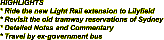 To celebrate the extension of the Metro Light Rail system to Lilyfield and pay tribute to the trams of the past, we will ride the new tram service to Lilyfield, and join an ex-government bus for a journey into the past. We'll inspect the many abandoned tramway reservations of yesteryear, from Randwick to Balmoral and many in between. Revisit the spot where three corridor trams ran-away at Athol, and see what's become of some of the long-closed tram depots.
